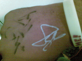 Um fã que esteve ontem no ensaio do Much Music Video Awards teve o autografo de Selena Gomez e Lady Gaga em sua mão, confira a foto: