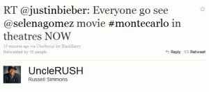 Russell deve ter gostado muito de conhecer Selena, já que também deu uma força para a divulgação do novo filme dela, Monte Carlo, ele postou citando Justin: