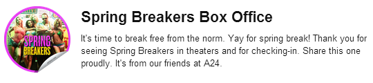 1º Passo: Siga as instruções deste post para saber como se cadastrar!2º Passo: Após ter seu cadastro feito, você pode começar dando “check-in”, confira quais adesivos do filme serão disponibilizados, e quais já estão valendo: Adesivo “Coming Soon”: Este adesivos será dado para check-ins até o dia 14 de Março. Clique aqui, dê check-in e ganhe o seu! Adesivo “Spring Breakers”: Este adesivo estará disponível do dia 15 de Março até 24 de Março. Quando for a época, entre aqui, faça check-in e ganhe seu sticker! Adesivo “Spring Breakers Box Office”: Este adesivo estará disponível a partir do dia 25 de Março e ficará até o filme sair de cartaz nos Estados Unidos. A partir da data informada, clique aqui, dê check-in e ganhe seu adesivo!3º Passo: Após juntar 20 adesivos, variados, você poderá pedir uma cópia real deles! O site envia para você sem custo algum, e você pode pedir mais cópias a cada 30 dias.